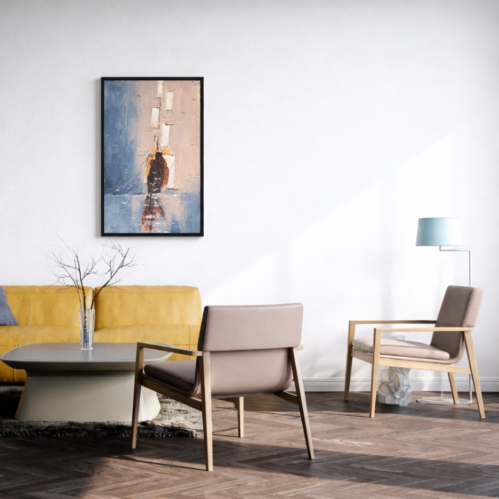 A serene abstract painting inspired by the quiet presence of a sailing boat at sea. Layered brushstrokes, soft blues, and warm neutral tones create a sense of movement and reflection, bringing calm and balance to the space.